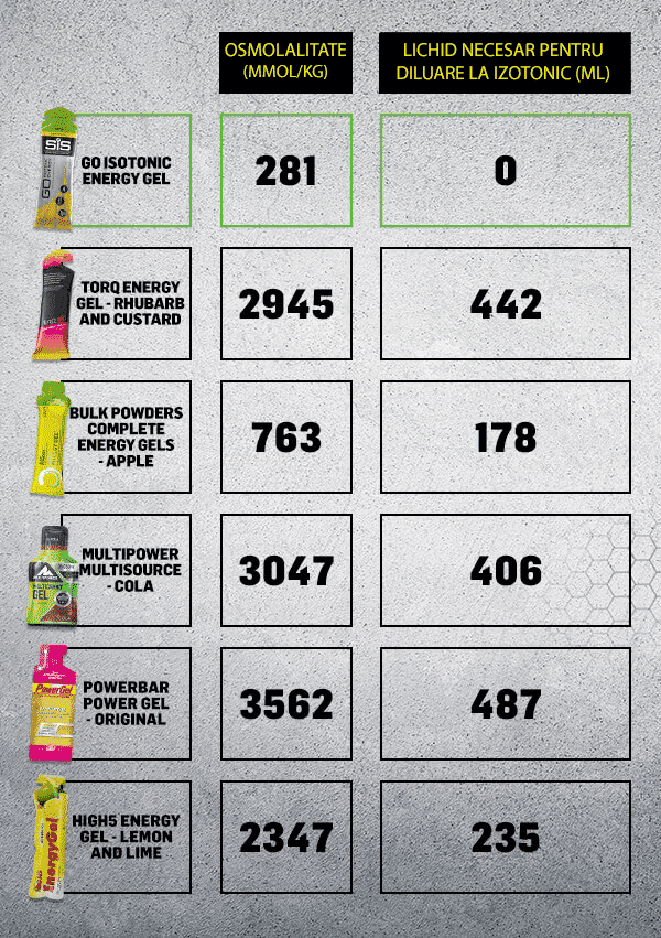 De asemenea, riscul de a va deranja la stomac este unul redus. Gelurile energizante cu o osmolalitate (= masura particulelor osmotic active intr-un litru de apa) apropiata de cea a continutului gastric (care este izotonic) pot duce la eliberarea unei cantitati mai mari de carbohidrati la nivelul intestinului subtire in comparatie cu gelurile hipertonice (dense si concentrate).