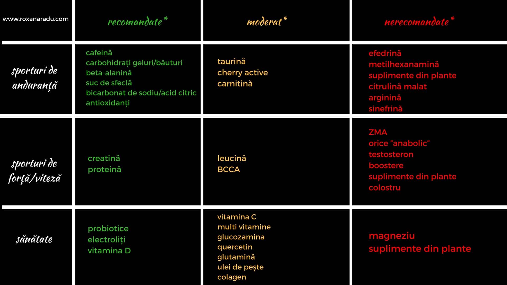 - recomandate* – suplimente care functioneaza si pentru care exista indeajuns de multe studii si cazuri care denota ca ajuta/imbunatatesc performanta sportiva