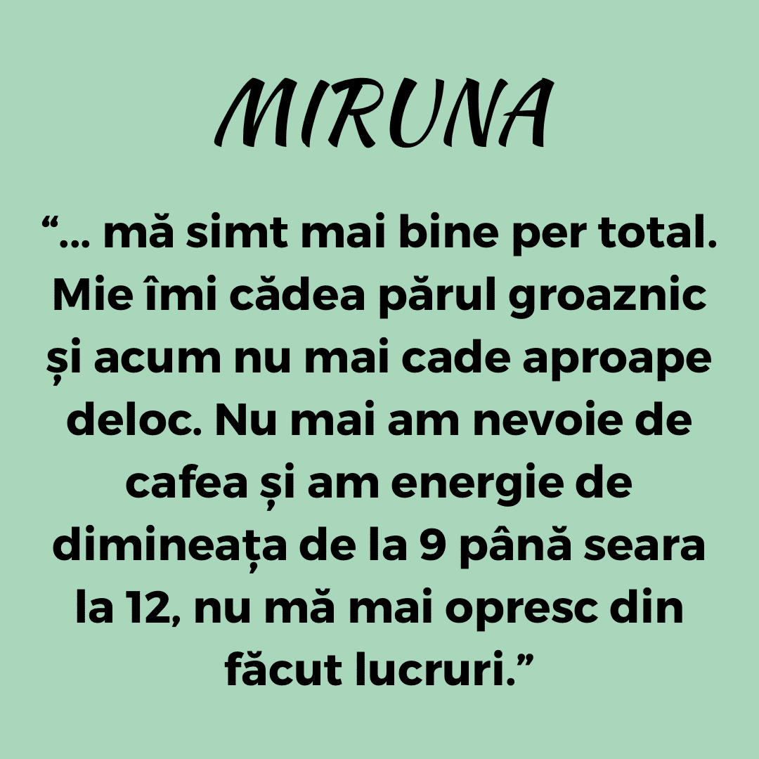 ” … ideea e că mă simt mai bine per total. Mie îmi cădea părul groaznic și acum nu mai cade aproape deloc. Și de asemenea nu mai am nevoie de cafea și am energie de dimineața de la 9 până seara la 12, nu mă mai opresc din făcut lucruri. “