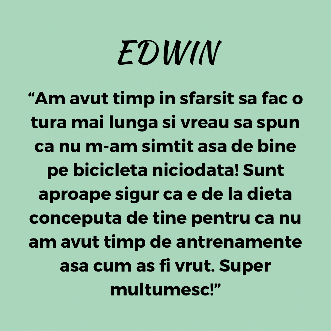 “Am avut timp in sfarsit sa fac o tura mai lunga si vreau sa spun ca nu m-am simtit asa de bine pe bicicleta niciodata! Sunt aproape sigur ca e de la dieta conceputa de tine pentru ca nu am avut timp de antrenamente asa cum aa fi vrut. Super multumesc!”